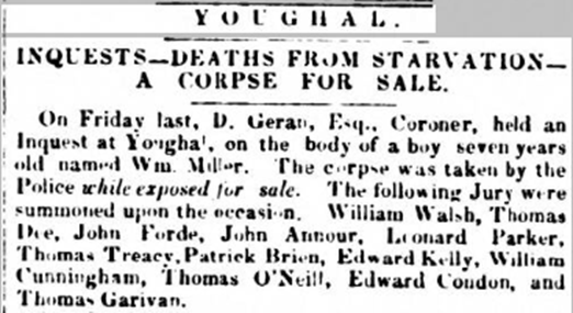 The inquest in Youghal was held on Friday January 29th, 1847. The jury of twelve men that was sworn in were: William Walsh, Thomas Dee, John Forde, John Annour, Leonard Parker, Thomas Treacy, Patrick Brien, Edward Kelly, William Cunningham, Thomas O’Neill, Edward Condon and Thomas Garivan.